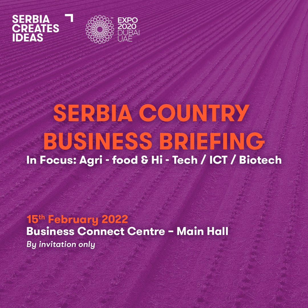 Within the organization of the Serbia National Day at the World’s Exhibition Expo 2020 Dubai, the Republic of Serbia is organizing a special investment and business event „Serbia Country Business Briefing“, at the Business Connect Centre February 15th (from 3 p.m. until 5 p.m.)