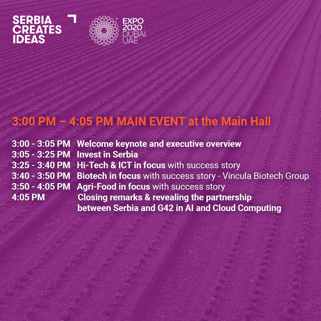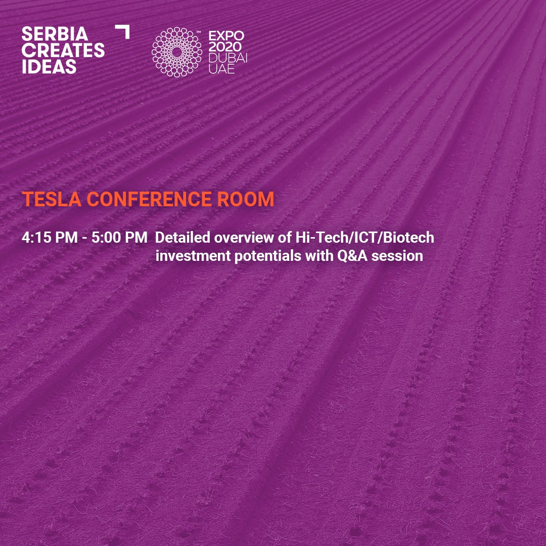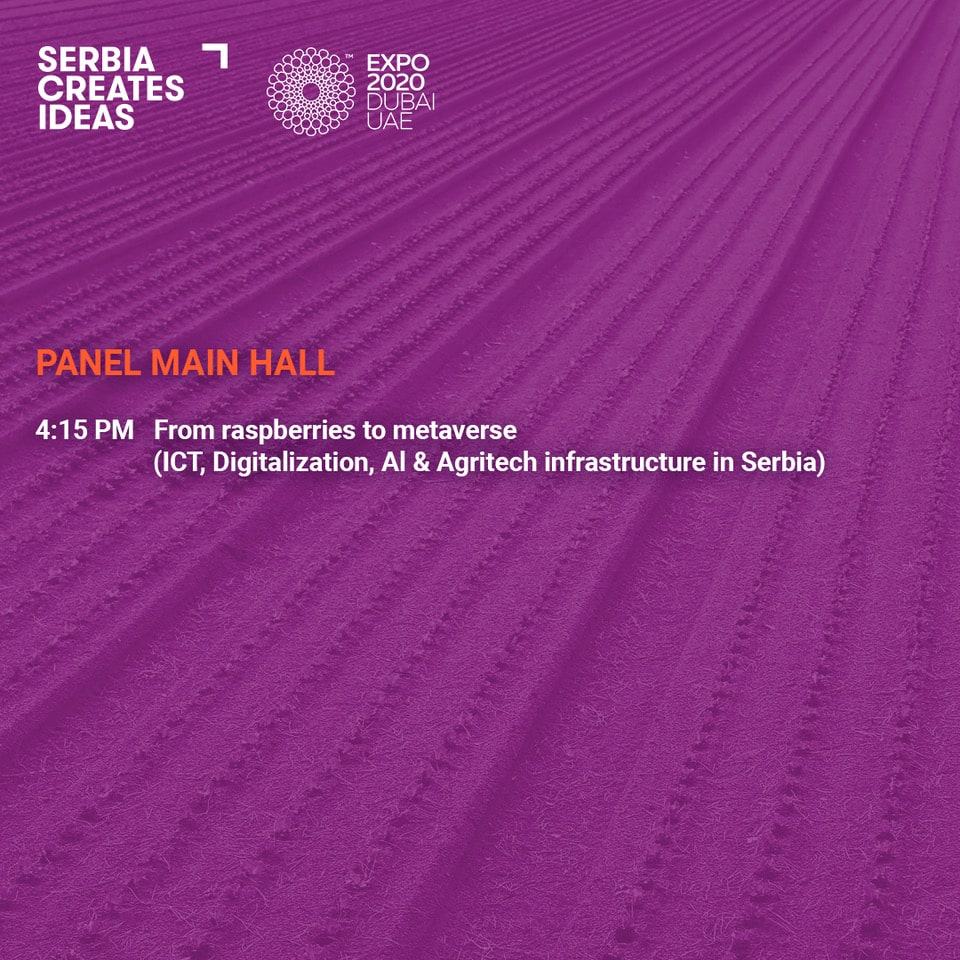Right after the investment conference and signing the agreement, starting from 4:15 p.m., at the Abu Dhabi Hall starts the Panel Discussion „Serbia Creates Tech: from Raspberries to metaverse“. Leaders from Serbia's private and public sectors will discuss the unique journey that reshaped the country in terms of the digital revolution and competitive investment opportunities while revealing exciting plans for the future. Panelist will be Milan Dobrijević , State Secretary, Ministry of Trade, Tourism and Telecommunications, Ana Ilić, Senior Advisor to the Prime Minister, Serbia Creates Director & Deputy General Commissioner at Serbia Pavilion at EXPO 2020 Dubai, Ana Šarenac, Assistant Director, Office for the IT and eGovernment, Government of the Republic of Serbia, Nebojša Bjelotomić, CEO, Digital Serbia Initiative and Vladimir Crnojević, CEO, Biosense Institute.